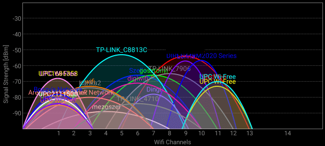 Mértem egyet a lakásban, hogy miért is ilyen lassú a wi-fi, nos, a következőket találtam. A kitakart nevű piros görbe, 9-es csatornán, azok vagyunk mi: